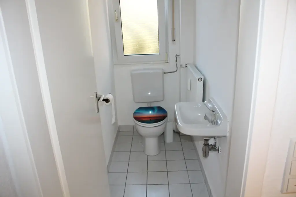 Der Bodenbelag der Wohnung besteht aus hochwertigem Parkett. Die Toilette ist separat neben dem Bad, welches mit einer Badewanne und einem Duschrollo ausgestattet ist.